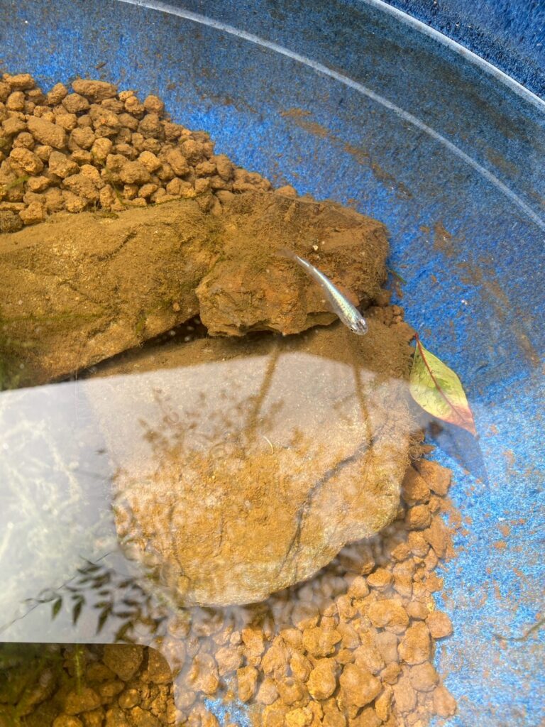 去年の夏は暑さのせいか、一匹、また一匹と星になっていき、冬には最後の一匹もまったく姿が見えなくなりました。てっきり全滅してしまったのだと思い、ビオトープもそのままにしていました。ところが、やっと暖かくなってきた先日、水面近くを元気に泳ぐ姿を見つけてびっくり。思わず「生きとったん!?」と声が出ました。
