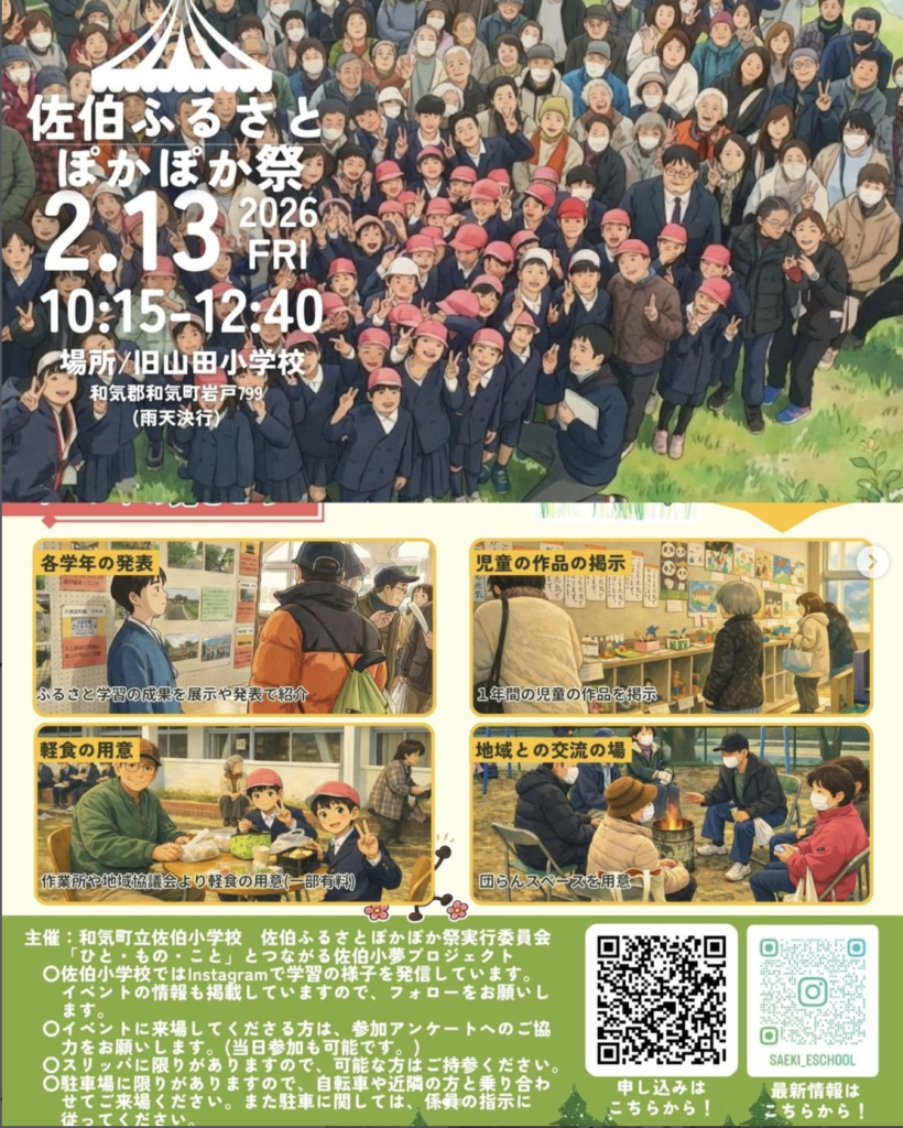 このお祭りは、和気町立佐伯小学校の児童による「ふるさと学習」の成果発表会を兼ねた、地域交流の場です。